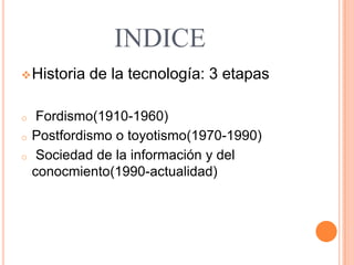 Este documento resume las tres etapas principales de la historia de la tecnología: el fordismo (1910-1960), caracterizado por la producción masiva y la especialización laboral; el postfordismo o toyotismo (1970-1990), con una mayor variedad de productos y obsolescencia programada; y la sociedad de la información y el conocimiento (1990-presente), donde las ideas, la información y el conocimiento son valiosos y se comparten a través de redes.