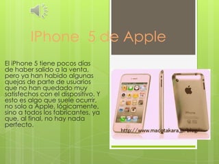 El documento habla brevemente sobre algunas quejas de usuarios sobre el recién lanzado iPhone 5 de Apple, señalando que pequeños problemas con nuevos dispositivos son comunes para todos los fabricantes debido a que la perfección no es posible.