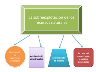 La sobreexplotación de los recursos naturales ha llevado a la disminución de superficies utilizables, el agotamiento de minerales como el estaño y el platino, y la extracción excesiva de madera, lo que amenaza la supervivencia de especies protegidas debido a la caza y el comercio ilegal.