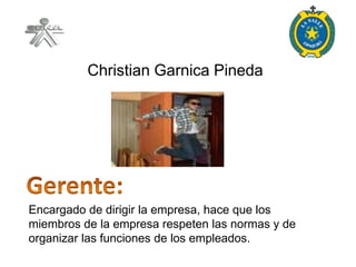 El documento describe la estructura organizativa de una empresa de servicios de reparación de computadoras en Zipaquirá, destacando los roles de varios miembros del equipo y sus responsabilidades. La empresa busca prestar un servicio eficiente y amigable a los clientes, fomentando su satisfacción y retorno. Además, se establece la meta de ser una de las empresas más reconocidas en su área en un plazo de tres años.