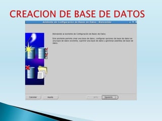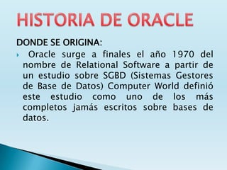 Oracle es un sistema gestor de base de datos objeto-relacional que permite el almacenamiento y gestión de grandes volúmenes de datos de forma organizada. Las tablas son la unidad básica de almacenamiento de datos en Oracle, donde los datos se almacenan en filas y columnas. PL/SQL es un lenguaje de programación incorporado a Oracle que permite realizar operaciones complejas sobre los datos almacenados.