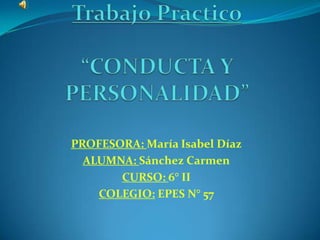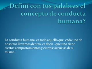 El documento presenta información sobre la conducta humana y la personalidad. Explica que la conducta humana son los comportamientos que cada persona tiene, mientras que la personalidad no es innata sino que se va desarrollando a partir de las experiencias vividas. También destaca que la familia juega un papel importante en la formación de la identidad de una persona y que fuera del núcleo familiar, los amigos son significativos para los adolescentes.