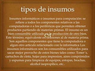 Un insumo es un recurso material necesario para realizar trabajos con equipos de computo, como toners, cartuchos, hojas para impresión. Existen insumos originales fabricados por la misma compañía del dispositivo e insumos genéricos de compañías ajenas buscando compatibilidad. Otros componentes fundamentales de las computadoras son el teclado, mouse, monitor e impresora, los cuales han evolucionado en tecnología y prestaciones a lo largo del tiempo.