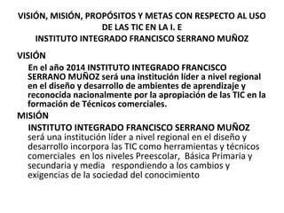 El documento presenta la visión, misión, objetivos y metas del Instituto Integrado Francisco Serrano Muñoz con respecto al uso de las TIC en la educación. La visión es convertirse en una institución líder regional en el diseño de ambientes de aprendizaje y reconocida nacionalmente por la apropiación de las TIC. La misión es incorporar las TIC como herramientas para formar técnicos comerciales. Los objetivos generales incluyen integrar las TIC para el desarrollo integral de los estudiantes.