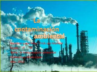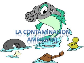 Este documento define la contaminación ambiental como la presencia de agentes nocivos en el ambiente que pueden dañar la salud, la vida silvestre o el uso de la tierra. Explica que las principales fuentes de contaminación son industrias, residuos domésticos, agricultura y vehículos. Luego describe los tres tipos primarios de contaminación: del agua, del suelo y del aire.