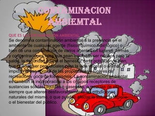 Este documento define la contaminación ambiental como la presencia de agentes físicos, químicos o biológicos en el ambiente que pueden ser dañinos para la salud humana, plantas, animales o ecosistemas. Explica que existen diferentes tipos de contaminación como la del agua, suelo y aire, y enumera algunas de sus principales causas como desechos industriales y domésticos, así como emisiones de vehículos. Finalmente, propone medidas para prevenir la contaminación como controlar el uso de pesticidas, mejorar la