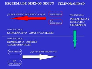Este documento presenta una introducción a los diferentes diseños de estudios de investigación, incluyendo diseños no experimentales, cuasi experimentales y experimentales. Explica brevemente cada diseño y ofrece ejemplos. También discute aspectos éticos, administrativos y técnicos a considerar al seleccionar un diseño de estudio.
