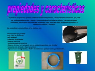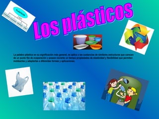 Los plásticos son polímeros sintéticos derivados principalmente del petróleo que pueden ser moldeados y tienen propiedades como ligereza, resistencia química y bajo costo. Se clasifican en termoplásticos y termoestables según su comportamiento al calor y se fabrican mediante procesos como moldeo por inyección, extrusión y soplado. Algunos plásticos ahora se hacen de recursos renovables como el almidón para ser biodegradables.