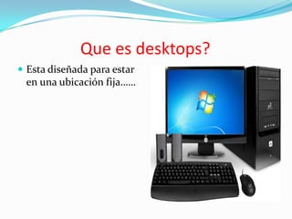 El documento compara y contrasta las características de las computadoras de escritorio, laptops y tabletas. Explora las diferencias en movilidad, energía eléctrica, hardware, software y otros componentes entre estos tres tipos de dispositivos.