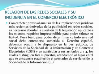 Este documento discute la relación entre las redes sociales y el comercio electrónico. Explica que las redes sociales pueden beneficiar al comercio electrónico al permitir que las empresas se comuniquen con los clientes actuales y potenciales, den a conocer sus productos a una audiencia segmentada, y aumenten su marca. También señala que los usuarios de redes sociales pueden informar a otros sobre sus experiencias con empresas de comercio electrónico.