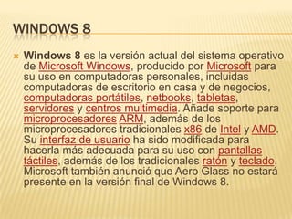 Windows 8 es la última versión del sistema operativo de Microsoft diseñado para computadoras de escritorio, portátiles, tabletas y otros dispositivos. Introduce una nueva interfaz de usuario táctil y soporte para procesadores ARM además de x86. Estará disponible en cuatro ediciones y Microsoft ofrece actualizaciones a precios reducidos desde versiones anteriores de Windows hasta el 31 de enero de 2013.