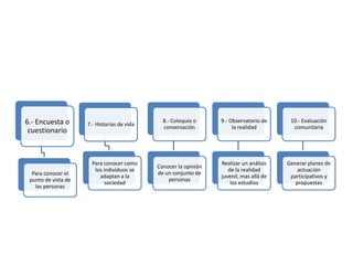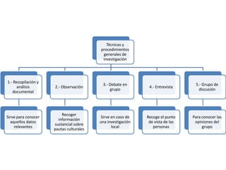 Las técnicas generales de investigación incluyen la recopilación y análisis de documentos, observación, entrevistas, debates en grupo, grupos de discusión, encuestas, historias de vida, coloquios, observatorios de la realidad, evaluaciones comunitarias, consultas a expertos, debates abiertos y seminarios. Estas técnicas sirven para recoger información relevante, conocer diferentes puntos de vista y generar planes de acción participativos.