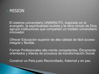 El documento presenta información sobre la misión, visión, reglamentos y procedimientos de la Universidad UNIMINUTO. Su misión es ofrecer educación superior de calidad con acceso flexible para formar profesionales éticos y líderes de transformación social. Su visión para 2012 incluye reconocimiento por su espiritualidad, aportes al desarrollo del país, programas académicos de alta calidad y amplia cobertura e impacto.