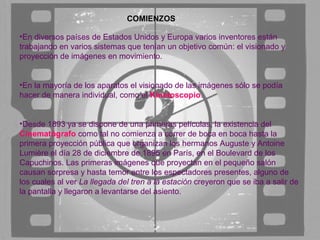El documento resume los orígenes y primeros avances del cine. En la década de 1890, inventores en Europa y Estados Unidos estaban trabajando en sistemas para proyectar imágenes en movimiento, culminando en la primera proyección pública de los hermanos Lumière en 1895. En las décadas siguientes, se hicieron esfuerzos para agregar sonido a las películas, lográndose con éxito en 1927. Las primeras películas en color también se desarrollaron durante este periodo, con Technicolor permitiendo filmar y proyectar