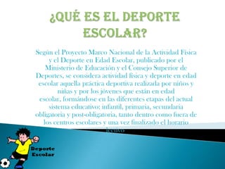 El documento describe el Plan de Actividad Física y Deporte en Edad Escolar de Castilla-La Mancha para el curso 2012-2013. El plan promueve la práctica deportiva entre niños y jóvenes en edad escolar dentro y fuera de los centros a través de actividades formativas, educativas y lúdicas organizadas por las consejerías, diputaciones, ayuntamientos y federaciones deportivas de la región.