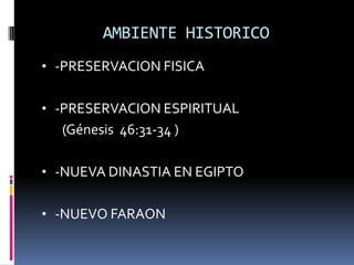 El libro del Éxodo narra la salida del pueblo de Israel de Egipto y la formación de Israel como nación teocrática bajo Moisés. Relata los diez plagas enviadas por Dios contra Egipto, la Pascua y la liberación final del pueblo de la esclavitud. Luego describe la travesía por el desierto y la recepción de los Diez Mandamientos y las leyes divinas en el Monte Sinaí, culminando con la construcción del Tabernáculo como centro de culto y presencia de Dios entre su pueblo.