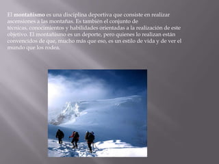 El montañismo consiste en realizar ascensiones a montañas y requiere de técnicas y habilidades para lograr este objetivo. Más que un deporte, para quienes lo practican es un estilo de vida y una forma de ver el mundo. El montañismo incluye actividades como senderismo, excursionismo, escalada en roca, hielo y deportiva, así como carreras y deportes en la montaña como el barranquismo y bicicleta de montaña.