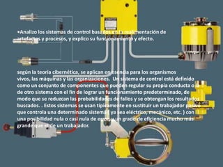 Este documento analiza los sistemas de control basados en la realimentación que se aplican a organismos vivos, máquinas y organizaciones para regular su propia conducta o la de otro sistema y lograr un funcionamiento predeterminado que reduzca fallos y obtenga los resultados deseados, como sustituir a un trabajador que controla sistemas eléctricos o mecánicos con menor posibilidad de error y mayor eficiencia.