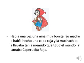 Caperucita Roja lleva pasteles a su abuela a través del bosque, pero se encuentra con un lobo que se dirige a la casa de la abuela. Más tarde, Caperucita descubre al lobo disfrazado de su abuela en la cama. Un cazador mata al lobo y rescata a Caperucita y su abuela. Caperucita aprende la lección de no hablar con extraños.