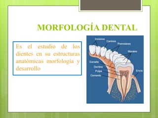 El documento describe las relaciones entre la morfología dental y diferentes especialidades odontológicas. La morfología dental estudia la estructura y desarrollo de los dientes. Esto está relacionado con histología dental, operatoria dental, biomateriales, cirugía bucal, odontopediatría, ortodoncia, endodoncia, anatomía topográfica, radiología, patología clínica, oclusión y prostodoncia.