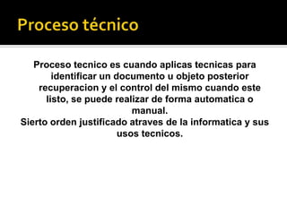 El documento habla sobre el control de la informática en los procesos técnicos. Explica que los procesos técnicos permiten identificar y recuperar documentos u objetos de forma automática o manual. También establecen un orden lógico a través de reglas y códigos para facilitar el manejo de procesos. Finalmente, señala que los procesos técnicos mantienen el orden en lugares como escuelas, fiestas o tiendas gracias a las reglas establecidas.