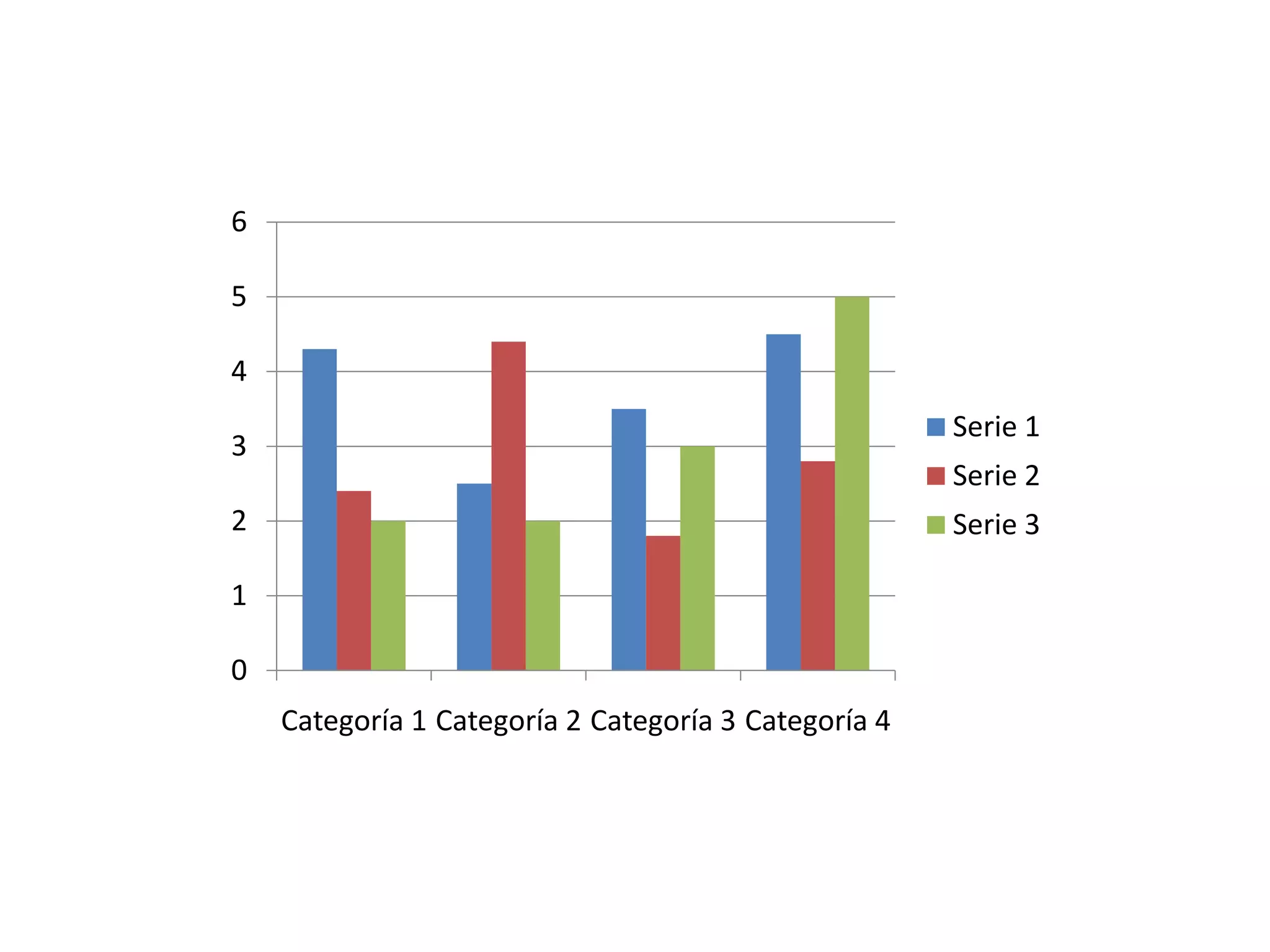 Este gráfico muestra tres series de datos numéricos para cuatro categorías diferentes. Los valores de la Serie 1 son mayores que los de la Serie 2 para todas las categorías, y los de la Serie 2 son mayores que los de la Serie 3.