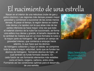 El documento describe las etapas del nacimiento, desarrollo y muerte de una estrella. Una estrella nace cuando regiones densas de una nebulosa de gas y polvo atraen más material, formando una esfera densa de hidrógeno. La compresión genera calor que fusiona el hidrógeno en helio y otros elementos. Cuando se agota el combustible nuclear, las estrellas ligeras se expanden como gigantes rojas antes de contraerse en enanas blancas que se enfrían lentamente.