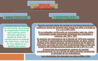 Este documento describe los tipos básicos de computadores. Explica que los computadores digitales convierten datos de entrada en números binarios de 0 y 1 para procesar la información. También describe cómo los primeros computadores de los años 70 podían verificar 8 bits de datos a la vez, formando un byte con 256 configuraciones posibles. A medida que los procesadores podían manejar más bits de datos simultáneamente, la velocidad de los computadores aumentó.