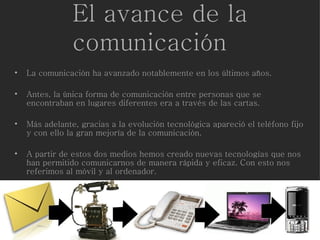 El documento describe la evolución de la comunicación entre jóvenes, desde las cartas y el teléfono fijo hasta las tecnologías modernas como el teléfono móvil, el ordenador y las redes sociales. Detalla el uso extensivo que hacen los jóvenes de estas herramientas para comunicarse y las principales plataformas que utilizan, como Tuenti, Facebook, Messenger, Fotolog y MySpace.