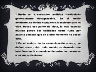 Este documento habla sobre el ruido y sus efectos en la salud. Define el ruido como un sonido no deseado que puede ser molesto o perjudicial para la salud humana si es demasiado intenso. Explica que el exceso de ruido puede causar enfermedades fisiológicas, psíquicas y sociológicas. Además, señala que cuanto mayor es la intensidad del ruido, mayores son los riesgos para la salud, incluyendo problemas cardiovasculares.