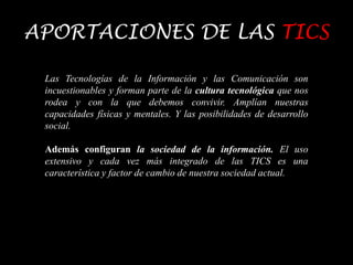Este documento resume las principales aportaciones de las tecnologías de la información y la comunicación (TIC), incluyendo el fácil acceso a información, canales de comunicación inmediata, gran capacidad de almacenamiento, automatización de trabajos e interactividad. También discute brevemente los sistemas de información y cómo aunque las TIC han sido importantes, los sistemas de información implican más que solo la tecnología y incluyen personas y procesos.