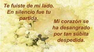 Este poema expresa la profunda tristeza y soledad que siente el autor después de la muerte de su madre. Describe el amor incondicional de una madre y la promesa de reunirse en el cielo algún día. El autor se consuela sabiendo que su madre ahora está en un lugar mejor junto a Dios, y pide su guía hasta que llegue el momento de reunirse para siempre.