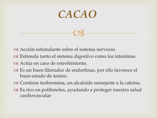 Contiene teobromina, un alcaloide semejante a la cafeína.