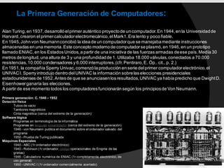 La evolución del computador se ha dado a través de cinco generaciones principales. La primera generación (1940-1952) utilizaba tubos de vacío y cintas magnéticas. La segunda generación (1955-1964) introdujo los transistores. La tercera generación (1964-1971) usó circuitos integrados. La cuarta generación (1971-presente) trajo los microprocesadores y los computadores personales. La quinta generación (1982-1989) vio avances en inteligencia artificial e Internet.