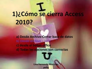 Este documento contiene 10 preguntas y respuestas sobre cómo cerrar Access 2010, las combinaciones de teclas para cerrarlo, y las diferentes barras e iconos en la interfaz de usuario de Access 2010, incluida la cinta de opciones, la barra de estado y la barra de acceso rápido. Proporciona información sobre cómo ocultar la cinta de opciones y dónde encontrar las opciones de abrir, cerrar y guardar una base de datos. También explica que parte de la interfaz muestra información cambiante y cómo acceder a la documentación