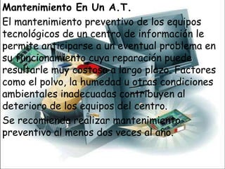 El documento habla sobre los diferentes tipos de mantenimiento de equipos tecnológicos. Explica que el mantenimiento preventivo permite anticiparse a problemas futuros al revisar y ajustar máquinas y dispositivos periódicamente. También describe el mantenimiento correctivo como la reparación de equipos una vez averiados, el mantenimiento predictivo que monitorea variables para detectar posibles fallas, el mantenimiento cero horas que deja el equipo como nuevo al revisar y reparar todos sus componentes, y el mantenimiento en uso que lo realizan