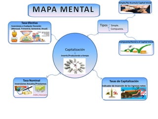 Este documento resume los conceptos básicos de capitalización e inversiones, incluyendo los tipos simple y compuesto de capitalización, las tasas nominales y efectivas, e inversiones anuales o a cualquier duración.