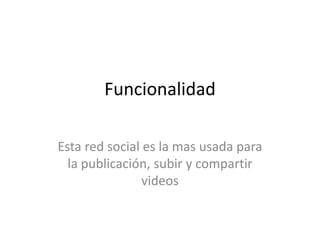 YouTube es la red social más utilizada para publicar, compartir y ver videos. Fue fundada en 2005 por tres ex empleados de PayPal y fue adquirida por Google en 2006 por $1,650 millones. Los videos en YouTube tienen un límite máximo de 10 minutos y 2GB, y el sitio ofrece la capacidad de descargar videos y hacer anotaciones dentro y fuera de los clips de video.