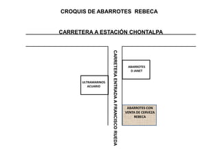 El documento lista 4 negocios de abarrotes en la zona: Croquis de Abarrotes Rebeca en la Carretera a Estación Chontalpa, D Janet Ultramarinos, Acuario en la Carretera Entrada a Francisco Rueda, y Abarrotes con Venta de Cerveza Rebeca.