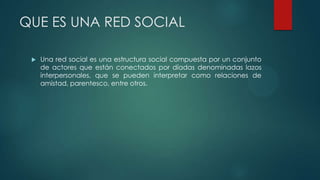 Una red social es una estructura social compuesta por individuos (nodos) y las relaciones entre ellos (enlaces). El análisis de redes sociales estudia esta estructura aplicando la teoría de grafos. En internet, las redes sociales facilitan la comunicación y conexión entre personas, ya sea entre conocidos o para hacer nuevas conexiones. Existen diferentes tipos de redes sociales en internet como las genéricas como Facebook y Twitter, las profesionales como LinkedIn, y las verticales enfocadas en un tema específico.