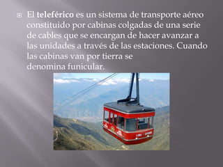 El documento describe los principales componentes y características de los teleféricos. Un teleférico consiste en cabinas suspendidas de cables que transportan personas entre estaciones. Algunos sistemas usan dos cabinas para crear contrapeso, mientras que otros tienen múltiples cabinas. Los teleféricos se usan comúnmente para acceder a áreas de difícil acceso debido a diferencias de altura y son impulsados eléctricamente. El documento también proporciona ejemplos notables de teleféricos en todo el mundo.
