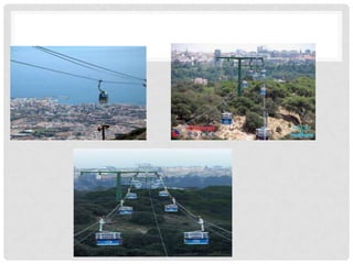 Este documento proporciona información sobre los teleféricos. Menciona que los teleféricos son sistemas de transporte aéreo que usan cabinas colgadas de cables para transportar pasajeros entre estaciones. Luego enumera varios ejemplos notables de teleféricos en países de América Latina y otros lugares. También proporciona algunos récords interesantes, como que el teleférico más largo y alto del mundo se encuentra en Venezuela, y que el teleférico más largo de un solo tramo está en Colombia.