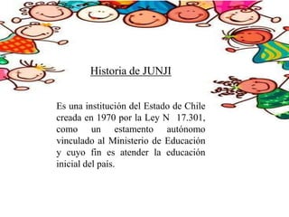 JUNJI es una institución estatal chilena creada en 1970 para brindar educación inicial de calidad a niños en situaciones de vulnerabilidad. Su misión se centra en tres ejes: calidad educativa, ampliación de cobertura y promoción del buen trato. Históricamente, JUNJI ha supervisado, fiscalizado y empadronado establecimientos educativos iniciales para garantizar la calidad. Evalúa cinco áreas de gestión en sus establecimientos.