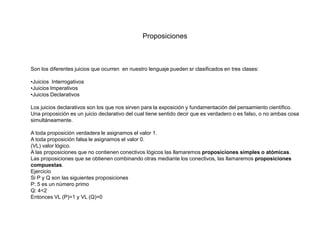 El documento describe las proposiciones y operaciones lógicas. Define proposiciones como juicios declarativos que pueden ser verdaderos o falsos. Introduce conectivos lógicos como la negación, conjunción, disyunción y condicional y sus tablas de verdad. También cubre circuitos lógicos básicos como compuertas NO, Y y O y su relación con valores lógicos de proposiciones.