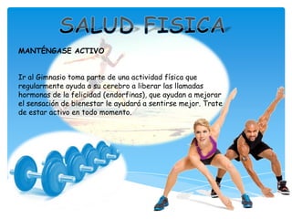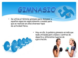 El documento habla sobre diferentes tipos de ejercicios y actividades que se pueden realizar en un gimnasio. Describe ejercicios de pesas, aeróbicos, yoga y otros para trabajar diferentes partes del cuerpo. También menciona los beneficios de mantenerse activo para la salud física y mental.