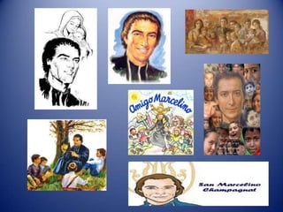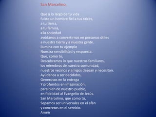 El documento es una oración dedicada a San Marcelino Champagnat pidiéndole que los guíe a ser personas útiles para su comunidad como él lo fue, que los ilumine con su ejemplo de servicio y sensibilidad hacia los demás, y que les ayude a descubrir las necesidades de sus vecinos para servirlos de la manera más generosa posible, tal como predicó el Evangelio de Jesús.
