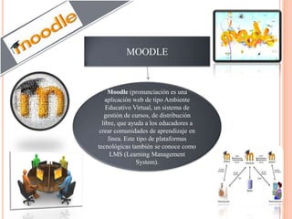 Moodle es un sistema de gestión de aprendizaje (LMS) de código abierto que ayuda a los educadores a crear comunidades de aprendizaje en línea. Fue creado por Martin Dougiamas en 1999 y desde entonces ha evolucionado a través del desarrollo comunitario. Moodle ofrece varios módulos interactivos como foros, cuestionarios y tareas que facilitan el aprendizaje en línea de una manera flexible y social.