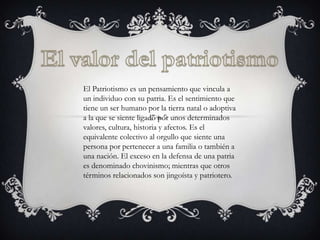 El patriotismo es el sentimiento de un individuo hacia su patria, vinculado por valores, cultura e historia compartidos. Representa el orgullo colectivo de pertenecer a una nación. Si bien el patriotismo es positivo, el exceso se considera chovinismo.