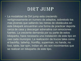 El documento habla sobre el aumento de la popularidad del dirt jump entre los jóvenes como una forma de practicar deporte cerca de casa y liberar adrenalina de manera segura. Explica que se necesitan más instalaciones de este tipo en los municipios debido a la alta demanda. También describe los diferentes trucos y acrobacias aéreas que se pueden realizar, así como los requisitos para la práctica de este deporte como el equipo de protección y el tipo de bicicleta más adecuada.