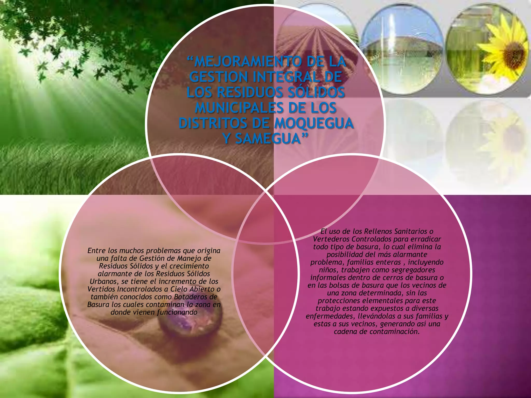 Este documento propone mejorar la gestión de residuos sólidos en los distritos de Moquegua y Samegua mediante la implementación de rellenos sanitarios controlados para eliminar los vertederos a cielo abierto, y a través de capacitaciones para promover mejores prácticas ambientales entre la población y entidades públicas y educativas. Asimismo, se elaborarán planes operativos para la recolección y transporte de residuos, y para redistribuir al personal de limpieza pública.